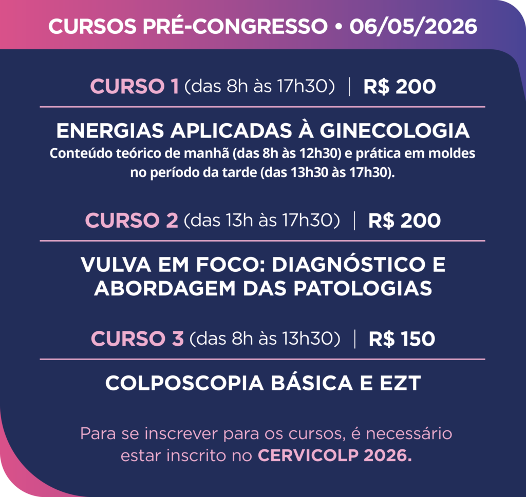 Além do desconto diferenciado no CERVICOLP, a participação nas atividades de Educação Continuada On-Line é GRATUITA para todos os sócios quites, assim como o acesso à área de Membros do site, com possibilidade de reassistir a gravação dos seminários on-line realizados desde 2020.